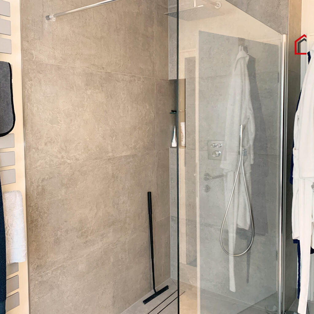 Statt der alten Dusche entstand eine bodengleiche, barrierefreie Dusche, die das neue Raumgefühl perfekt ergänzt: modern, komfortabel und pflegeleicht.