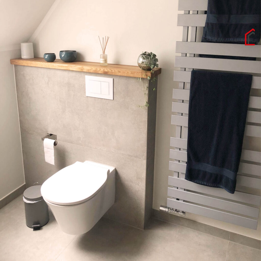 Nach dem Rückbau des alten Badezimmers – inklusive einer ungenutzten Badewanne und einer Dusche mit hoher Duschtasse – wurde der Raum vollständig neu aufgebaut.