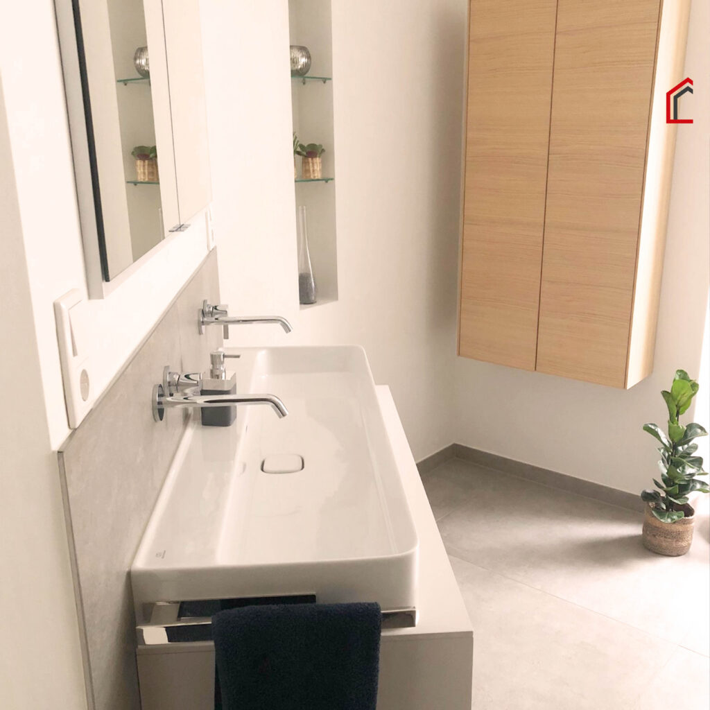 Das Ergebnis ist ein zeitgemäßes, offenes Badezimmer, das in Funktionalität und Design überzeugt.